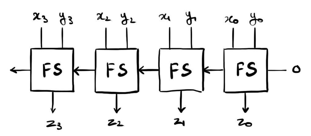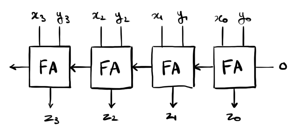 On peut combiner \(n\) full-adders pour obtenir un additionneur à \(n\) bits