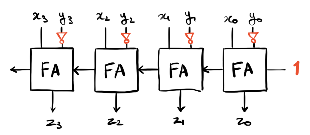 Ou bien, si en complément à 2 (mod \(2^n\)) :$$\begin{align} x - y &= x + (2^n - y) \\ &= x + (2^n-1 - y) + 1 \\ &= x + \neg y + 1 \end{align}$$