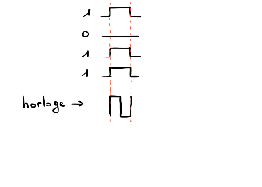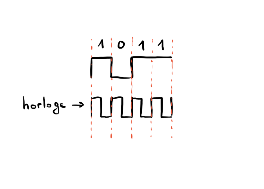 01000110 01000010 01010000 00000000int)$$2^{12} + 2^{14} + 2^{17} + 2^{22} + 2^{25} + 2^{26} + 2^{30} = 1178750976$$float)$$\simeq 1,5.2^{-57} \simeq 1,172.10^{-18}$$char *) : "FBP\0"On veut échanger des données d'un circuit à un autre